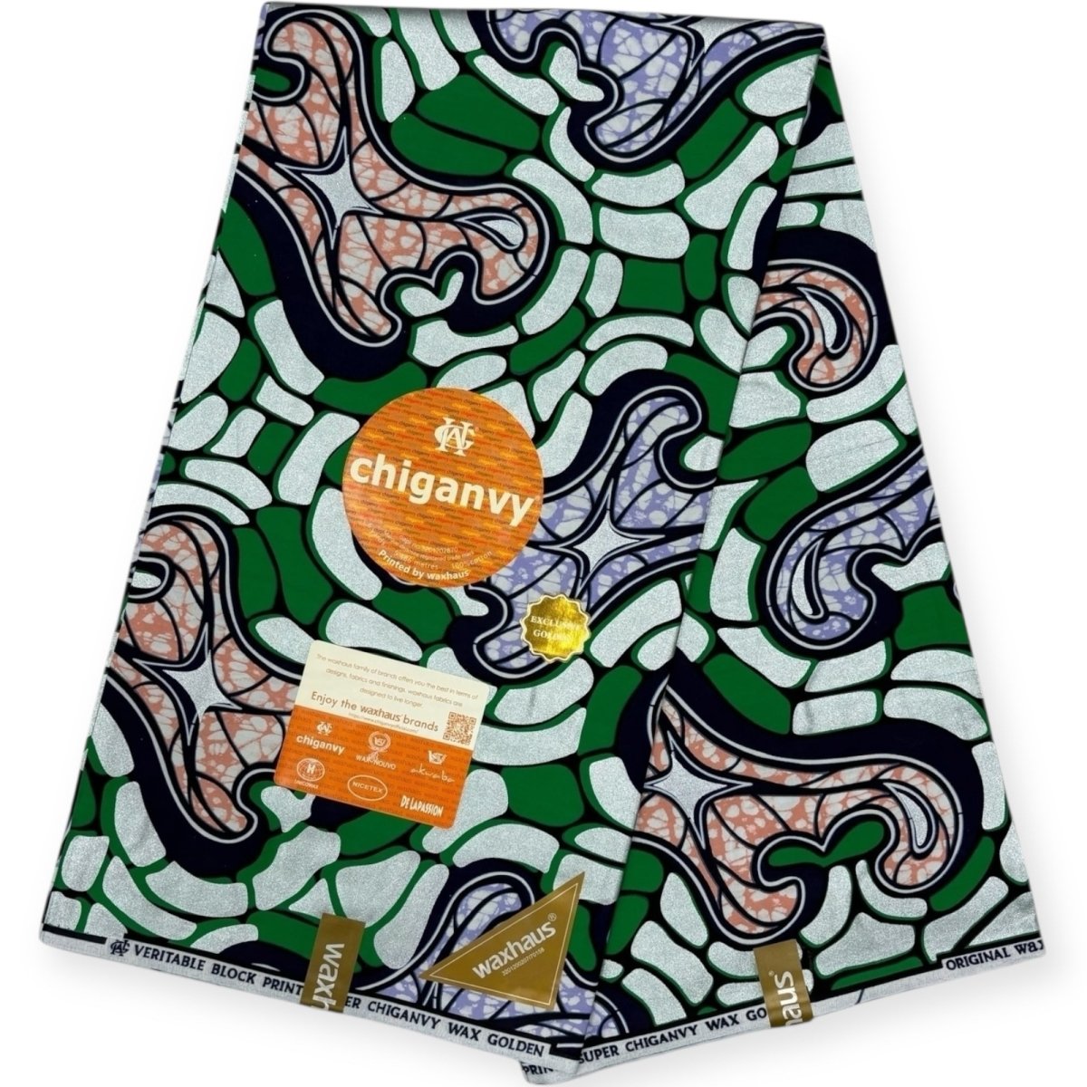 Wax Demi Super Chiganvy Brillant 6 Yards - 100% Coton - Vert, Rose, Violet et Argent